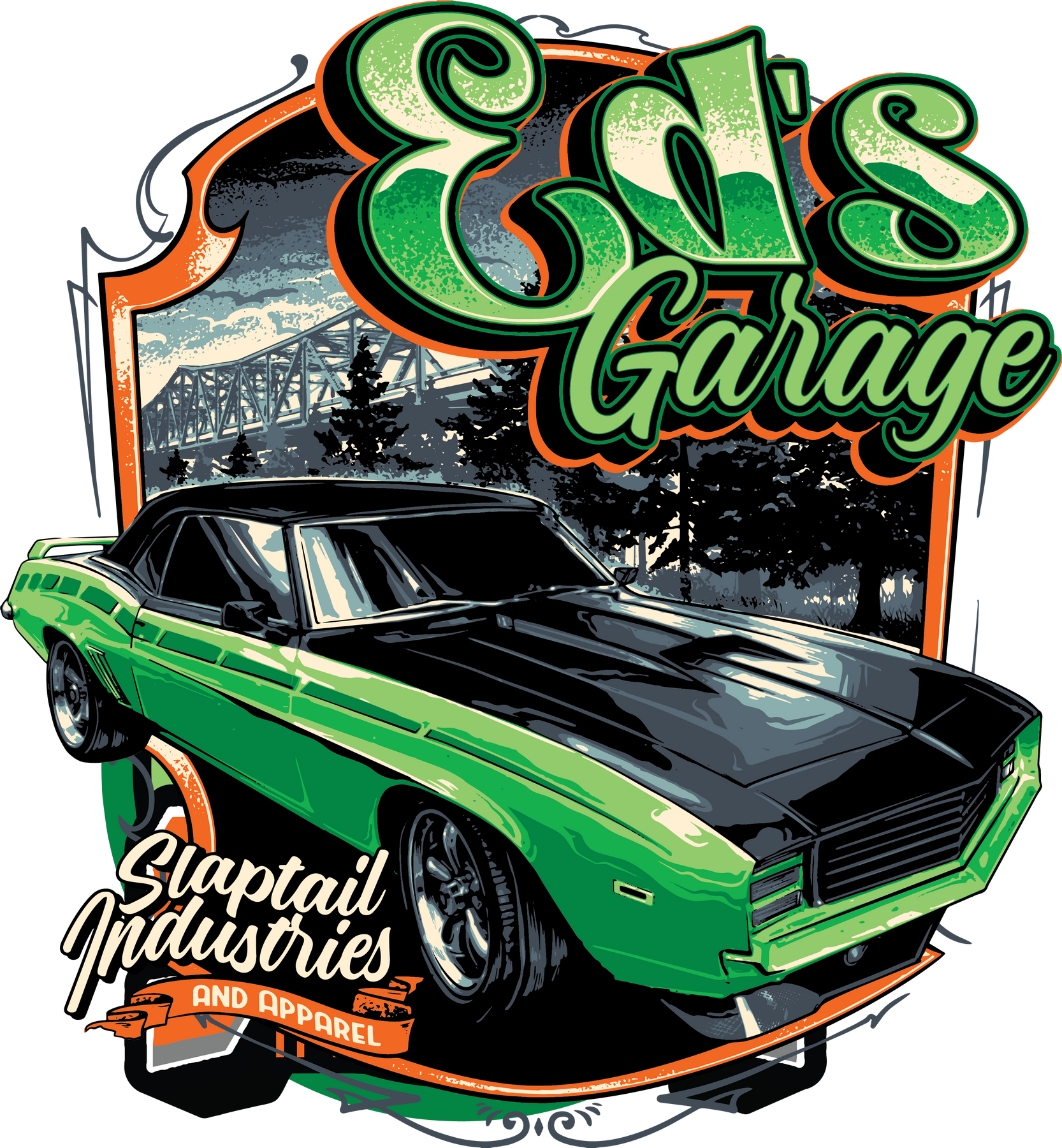 Theme/Features: Vintage car culture; bold green muscle car graphic and retro script; chest and back prints