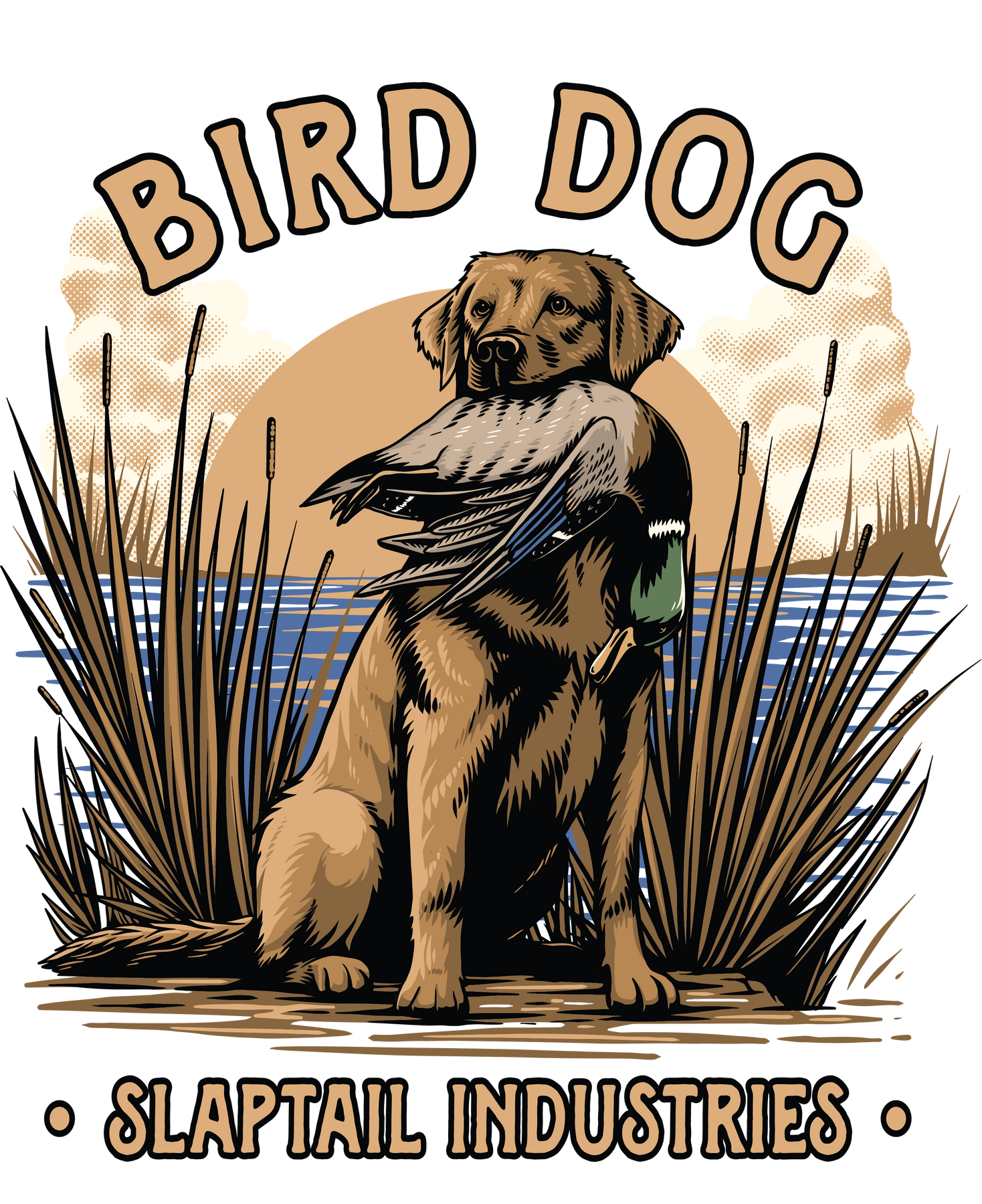This soft, lightweight tee carries warm, outdoorsy charm — a quiet nod to mornings spent at the water’s edge with a loyal retriever by your side. The front features a simple “BIRD DOG” arc; the back unfolds into a detailed scene: a bird dog sitting in reeds, clutching a duck, framed by a calm marsh sunset. The muted earth tones and vintage-inspired illustration create a worn-in, well-loved feel that layers easily under jackets or stands alone on warmer days. Breathable ring‑spun cotton keeps you comfortable while fieldwork, trail walks, or casual meetups; durable construction and tear‑away label mean the shirt wears and cares like something you’ll reach for again and again. For those who live for early light, marsh smells, and the steady company of a hunting dog, this shirt quietly tells that story.