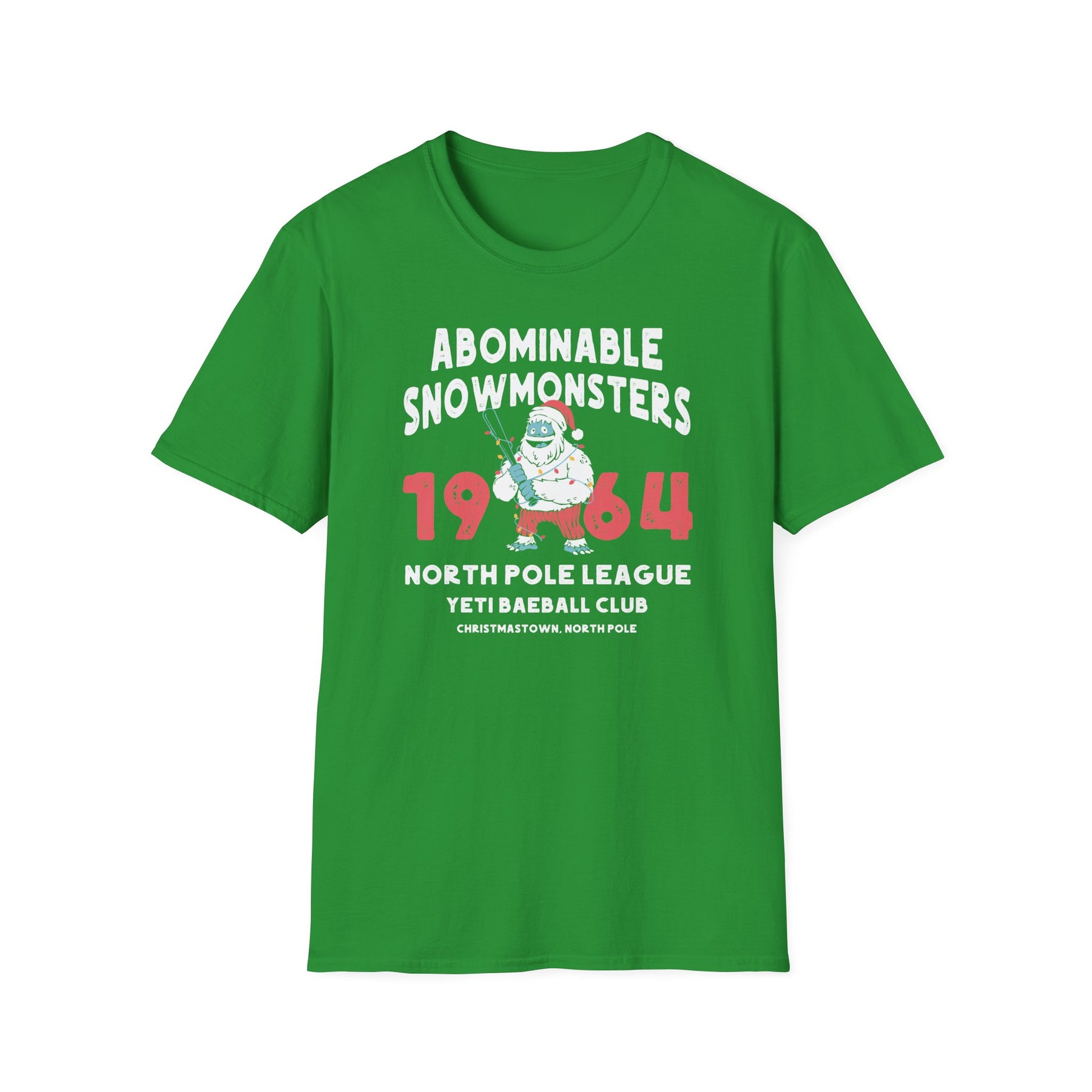 Kick back in this soft, easy tee that feels lived-in from the first wear. A playful “Abominable Snowmonsters 1964” graphic sits front-and-center — a vintage-yeti mascot and retro block numbers that nod to mid-century sports patches. The bright green fabric gives the design a cheerful, seasonal pop while the smooth ring-spun cotton keeps the shirt breathable and lightweight. Wear it to a cabin hangout, on a slow walk through frosty streets, or layered under a flannel while swapping stories around a fire. It’s casual, comfortable, and quietly nostalgic — the kind of shirt you reach for when you want to feel warm, a little mischievous, and wholly at home in winter rituals.