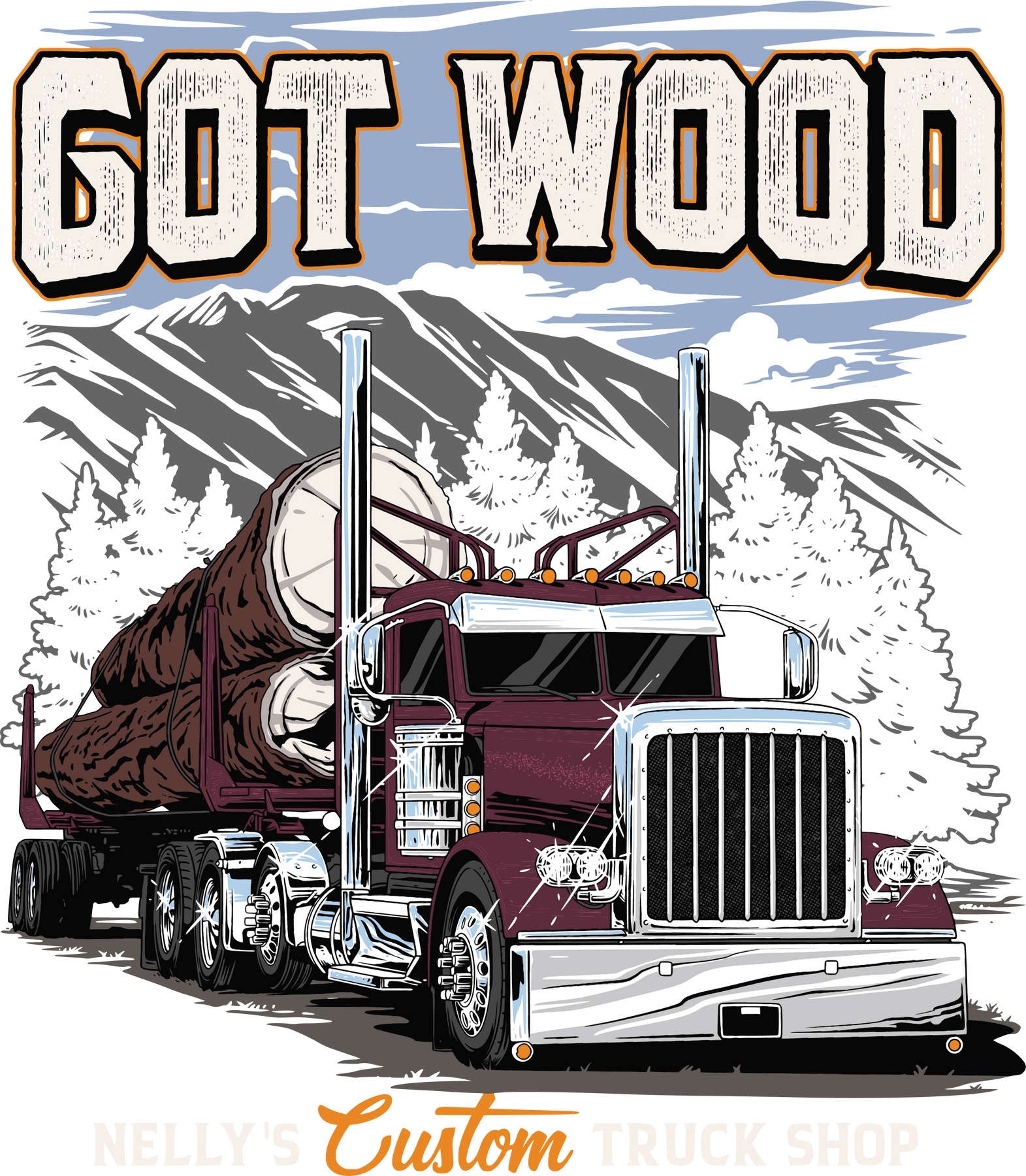 A rugged, lived-in tee that feels like it was made for open roads, early mornings, and honest work. The front carries a bold "GOT WOOD" badge in wood-grain lettering; the back tells the story — a heavy-duty truck framed by towering pines and distant mountains, stamped with “Nelly’s Custom Truck Shop.” Wear it while loading the trailer, grabbing coffee before sunrise, or swapping stories at the yard. The lightweight ring-spun cotton drapes easily, breathes on long drives, and softens with every wash. It’s a straightforward shirt for people who measure days in miles and cordwood, with print placement and durable knit built to last through the job and the journey.